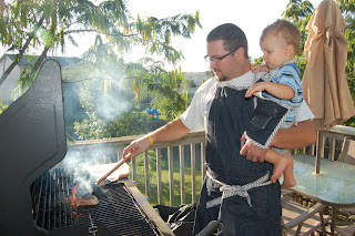 No - I can't get enough beef! I woke up yesterday, rolled over to John and said (at 7:15 in the morning), "can you please make steak for dinner tonight?" It was in my dreams all night and I was almost salivating by morning. So like a good hubby, he donned his grill apron, grabbed the boy, and went outside to grill for dinner last night. It was DELISH! He is getting soooo good at making steak. He made three KC strips (we usually only make 2) and though Aaron ate some of the third, I ate the rest PLUS my own! No leftovers for us! I could care less about the baked potato, corn, and bread - just wanted the steak!